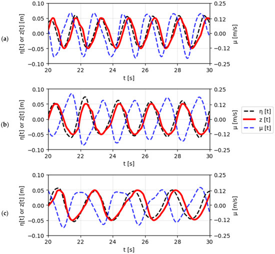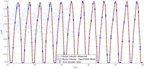 For all the numerical tests, the buoy was considered as a rigid cylindrical body with a height of 0.25 m and a radius of 0.10 m. The density of the buoy was = 190 kg m−3. The buoy was modelled as a floating body with two constraints: first, a fixed point at coordinates (7.05, 0, 0, 0) to prevent any pitching motion, due to wave impact, and to allow only translational motion in the z plane. No additional constraints, such as external forces, linear springs, or damping effects, were considered.