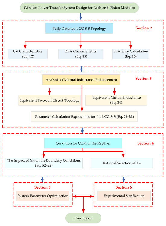 The remainder of this paper is organized as follows: Section 2 analyzes the proposed fully detuned LCC-S-S topology and demonstrates that the system exhibits CV and ZPA characteristics. Section 3 equivalently transforms the three-coil topology into a traditional two-coil topology and theoretically analyzes how the detuned relay coil enhances the system’s mutual inductance. Since the reactance of the relay coil governs the compensation network parameter calculations, Section 4 derives the current continuity condition of the rectifier bridge under the fully detuned LCC-S-S topology. Section 5 presents the system optimization workflow and design parameters of the coupling structure. Section 6 provides experimental results from the prototype and performs a loss analysis. Finally, Section 7 concludes this paper. A flowchart of the article structure is presented in Figure 1.