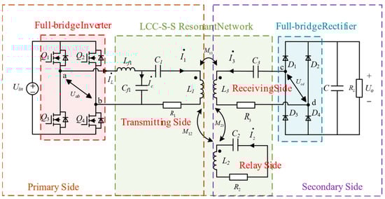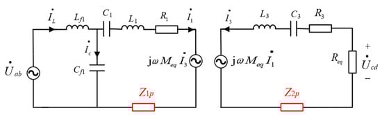 Compared to the two-coil LCC-S topology, equivalent impedances Z1p and Z2p are added to the transmitter and receiver sides in Figure 4, respectively. If the relay coil is fully resonant (Xp2 = 0), Z1p and Z2p simplify to Equations (27) and (28). The denominators of Z1p and Z2p are solely the internal resistance R2 of the relay coil, which introduces excessive resistance in the equivalent two-coil topology. This manifests as excessively high currents in the practical relay coil and significant losses in the system’s coupling mechanism. By properly detuning the resonance frequency of the relay coil, the current in the coils can be reduced while maintaining the required output voltage and power, thereby achieving higher system efficiency.