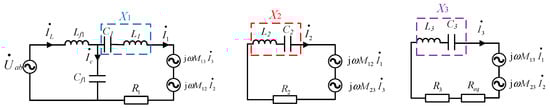 To analyze the mutual inductance enhancement effect of the relay coil, the three-coil topology is equivalently modeled as a two-coil topology. Without neglecting the internal resistances of all coils, Kirchhoff’s voltage equations are formulated for the four loops in Figure 3, yielding Equations (17)–(20).