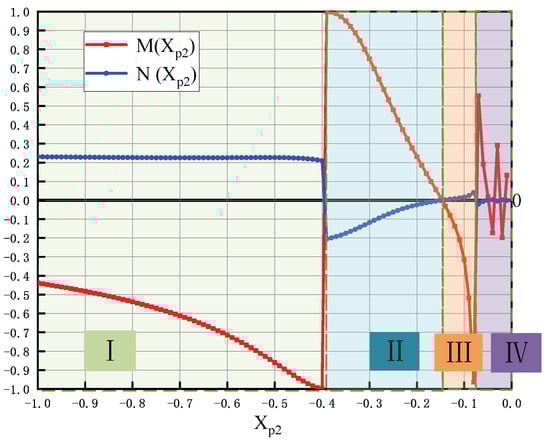 As depicted in Figure 7, the variation in Xp2 can be divided into four distinct regions (Regions I to IV). In Regions I and III, the current continuity condition of the rectifier bridge is unsatisfied. In Region IV, the small absolute value of Xp2 results in elevated system losses. Additionally, frequent waveform fluctuations observed in this section pose implementation challenges for subsequent hardware circuit design. Region II satisfies the current continuity condition of the rectifier bridge, and the absolute value of Xp2 remains within an optimal range, facilitating both the identification of the system’s maximum efficiency point and the achievement of stable voltage regulation characteristics in the circuit topology. Therefore, the final value of Xp2 should be selected from Region II.