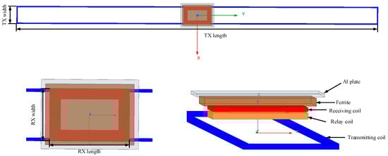 Based on the optimization results presented in Table 1, the coupling mechanism model is illustrated in Figure 9. Detailed parameters of the coupling structure are systematically listed in Table 2. The relay coil and receiver coil are arranged in a stacked configuration, with a magnetic core and an aluminum plate sequentially positioned above the receiver coil. The aluminum plate provides magnetic shielding and interference suppression for the overlying circuit board.