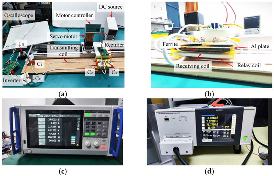 An experimental validation platform was constructed on the QTW-series rack-and-pinion modular sliding platform, as illustrated in Figure 10. The system architecture primarily comprises a DC power supply, a high-frequency inverter, a resonant compensation circuit, a coupling mechanism, a rectifier unit, and a DC servomotor. The detailed configuration of the experimental setup is explicitly depicted in Figure 11a–d. To achieve lightweight and compact design objectives for the rack-and-pinion modular system, a DC motor with an integrated drive-motor assembly was selected, whose performance metrics are systematically documented in Table 3.