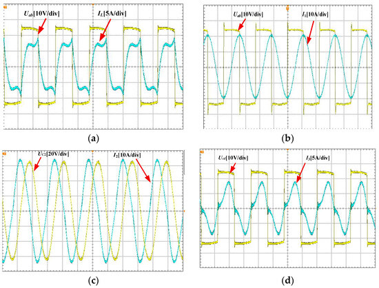 The inverter’s output voltage Uab and current IL are characterized in Figure 12a. As the system’s output stage exhibits weakly inductive behavior with a minimal input impedance angle, ZVS is achieved in the inverter operation. Figure 12b depicts the inverter output voltage Uab and the transmitter coil current I1, where I1 manifests as a sinusoidal waveform with a peak amplitude of 21 A and maintains a 90° phase shift relative to Uab. This phase relationship validates the resonant tuning of Lf1 and Cf1 at the switching frequency. The voltage UC2 and current I2 across the relay coil’s resonance capacitor C2 are presented in Figure 12c, with measured peak values of 66 V and 34 A, respectively. The voltage Ucd and current I3, illustrated in Figure 12d, confirm the absence of DCM at the rectifier input, thereby verifying the rationality of the system’s parameter design. This observation exhibits congruence between theoretical predictions and empirical observations. Under these operating conditions, the receiver coil current attains a maximum amplitude of 9 A.