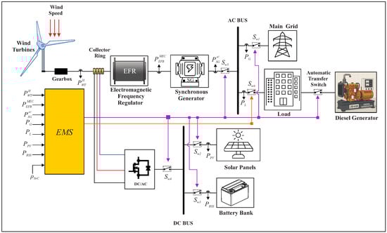 This article proposes a hybrid renewable energy generation system with the aim of providing clean and continuous electricity to the Macau City Campus while reducing dependence on fossil sources. Figure 1 shows the topology of the proposed configuration, which integrates wind turbines (WT), photovoltaic panels (PV), an energy storage system (ESS), a diesel generator (DG), an electromagnetic frequency regulator (EFR), a synchronous generator (SG), the campus load, and the connection point to the electricity grid. The system’s operation is coordinated by a centralized energy management system (EMS), which is responsible for real-time control of energy flows.