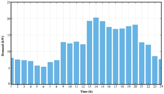 The load profile, which represents the variation in energy demand over the course of a typical day, was based on data provided by [15] and is illustrated in Figure 2. This figure shows the average hourly energy demand over a 24-h period. The daily energy consumption () is calculated by adding up the power consumed in each time interval and multiplying by the duration of that interval () [16]:
