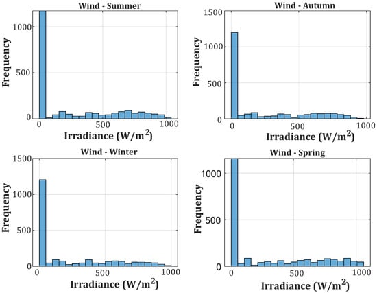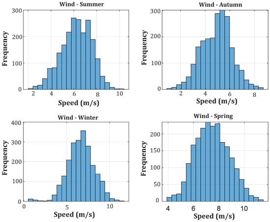 Figure 4 illustrates the seasonal distribution of wind speed in the same region and period, showing how the wind profiles behave in summer, autumn, winter, and spring.
