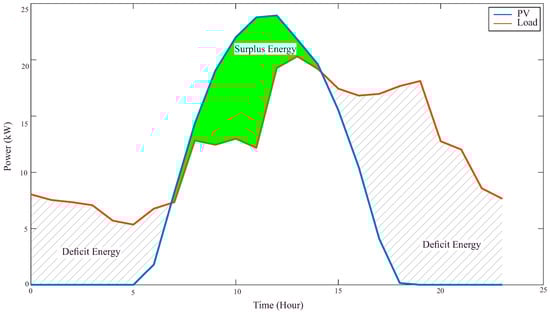 In hybrid renewable energy systems, the energy storage system (ESS) plays a critical role in mitigating the variability inherent in renewable sources, such as solar PV. Accurate modeling of the ESS is essential to ensure system reliability, meet load demand, and optimize economic costs. In this study, the ESS model is based on the daily energy balance between generation and demand, adopting the methodology proposed by Lai and McCulloch (2017) [21] for hybrid systems with high solar energy utilization. Thus, ESS sizing is based on the difference between PV generation and load demand over a 24-h period. For the UFRN campus in Macau/RN, the daily energy surplus was estimated at 120 kWh, as illustrated in Figure 5. This surplus ensures that the ESS can store energy during periods of high solar generation and supply it during periods of low generation or high demand, such as at night or on cloudy days. For the UFRN campus in Macau/RN, the daily energy surplus was estimated at 120 kWh, corresponding to the area under the photovoltaic curve above demand (highlighted in green in Figure 5). Note that although total daily consumption is higher than the peak generated, only the period in which PV generation exceeds load results in energy available for storage or injection into the grid. This value of 120 kWh was used as the minimum reference for storage capacity. However, the genetic algorithm applied to the sizing of the hybrid system identified an optimum storage capacity close to 200 kWh, in order to more reliably meet fluctuations in generation and demand.