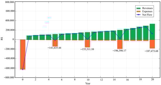 The NPV represents the net benefit of the project over its lifespan, considering a discount rate (MAT) that reflects the opportunity cost of capital or the minimum attractive rate of return (MARR). A positive NPV indicates that the project tends to generate benefits greater than costs over time, and is therefore economically viable. A negative NPV suggests financial unfeasibility, given that costs would exceed expected benefits [29].