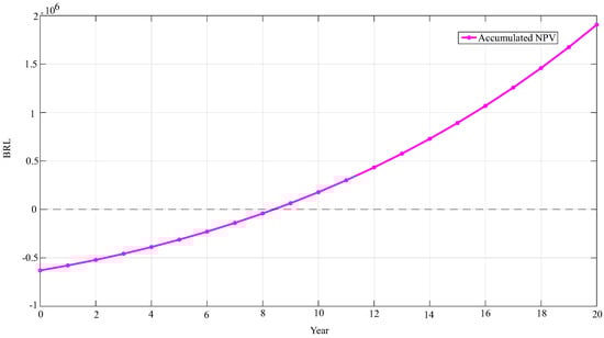 The economic feasibility analysis of energy projects is commonly performed using consolidated financial indicators, such as net present value (NPV), internal rate of return (IRR), benefit–cost ratio (B/C), and payback period. In this study, NPV was adopted as the main decision criterion, due to its wide acceptance in the literature, robust methodological basis, and ease of interpretation [28]. In addition, it was established as the objective function to be maximized, determining the ideal system configuration.