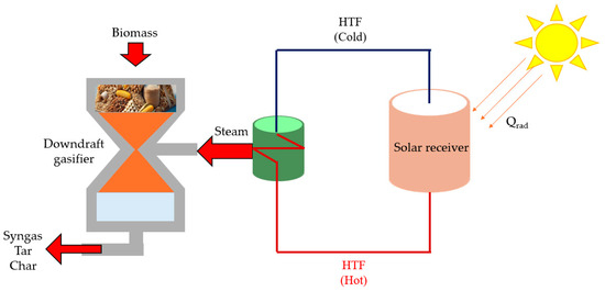 A solar furnace is assumed as the employed technology in SG, with a solar receiver Concentration Ratio (CR) of 100 [31]. A theoretical scheme of the functioning of the system is portrayed in Figure 1.