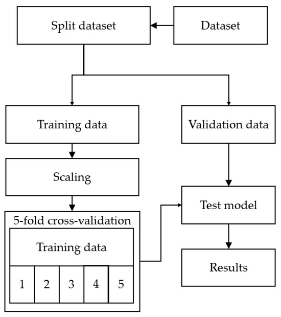 After obtaining the simulation results, the data was used to develop, train, and test ML models using the open-source Python libraries Scikit-learn (version 1.7.1) and TensorFlow (2.17). An overview of the process is portrayed in Figure 2. Artificial Neural Network (ANN), Support Vector Machine (SVM), and Random Forest (RF) algorithms were deemed suitable due to their ability to handle non-linear variables and not being prone to overfitting [18]. The input data was standardized using a standard scaler, while the output values were normalized using a MinMaxScaler for numerical stability, convergence, and error estimation. A 5-fold cross validation was employed (where the data is split into five subsets, using four subsets for training and the remaining for validation, five times) to assess the performance of the ML models, which has been reported to provide unbiased results efficiently when compared with other methodologies such as a 10-fold cross validation [54].
