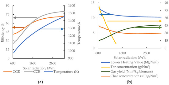 Results present the effect of the gasification operation parameters in the gasification efficiencies (CGE and CCE), the tar concentration, gas yield, and LHV. Figure 3a shows the effect of solar radiation in the CGE and CCE, considering a SBR of 0.5; it can be seen that increasing solar radiation (and hence, the gasification temperature) results in an increased efficiency (for both cold gas and carbon conversion), where the change is most significant in the CCE (especially at low temperatures where cellulose, hemicellulose, and lignin start decomposing) due to increases in the thermal decomposition of the biomass with temperature (which leads to more syngas being produced from gasification); the increase with temperature becomes less pronounced at higher temperatures due to most biomass being already decomposed. Figure 3b shows the effect of solar radiation on the syngas LHV (in MJ/Nm3), tar contents (in g/Nm3) and gas yield (in Nm3/kg of gasified biomass). The tar concentration decreases at a constant rate with increasing radiation, disappearing entirely at around 1350 kWh (or a gasification temperature around 1200 K) due to complete tar cracking/reforming [57]. The gas yield increases with radiation, with the effect being more significant in the same temperature range at which the major increase in CCE occurs (from 600 to around 1700 kWh), followed by a plateau in rate of change (due to thermodynamic limitations). The increase in gas yield with radiation occurs because increasing the radiation increases the thermal decomposition of solid biomass into syngas. Finally, it can be observed that the syngas lower heating value decreases with increasing temperature; this happens due to the reverse water gas shift and dry reforming reactions occurring and forming CO, H2, and H2O (and also explaining the increase in gas yield), as well as due to methane becoming steam reformed into H2, which has a lower volumetric LHV [58,59].
