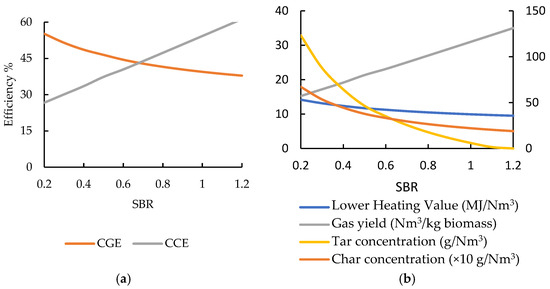 Figure 4 portrays the effect of the SBR in the efficiencies (Figure 4a) and syngas LHV, gas yield, and char and tar concentrations (Figure 4b), showing the effect considering a radiation of 800 kWh. It can be seen that increasing the SBR results in an increased CCE and decreased CGE; this occurs because with more steam, the rate of syngas formation from gasification increases (due to more steam becoming available for the oxidation and reduction of biomass), but the syngas becomes diluted with gases (excess steam). Figure 4b shows that the SBR has a significant inverse effect on the tar and char concentrations (that is, the tar decreases with the increasing SBR because the tar reforms into H2, CO, and CO2 [57]) and a direct effect in the gas yield; similarly, steam reforms char; hence, less char is formed with high SBR values. On the other hand, the SBR decreases the syngas LHV, in agreement with the decrease in CGE due to dilution with steam.