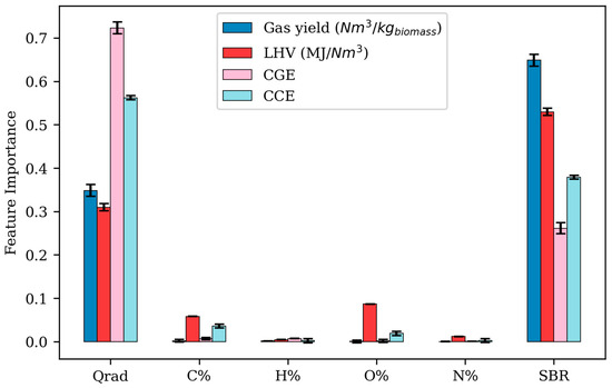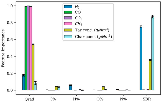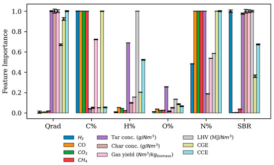 A feature importance analysis was conducted in the Random Forest algorithm using per target multi-output regression [26], with each of the targets trained in a separate RF. Results can be found in Figure 5 and Figure 6, while the cross-validation results of the model are found in Table 4. Overall, the most important features are the incident solar radiation assumed as captured by the solar collector (which translates into gasification temperature) and the SBR (as seen in Figure 5), where the gasification temperature (directly related to solar radiation) has the most significant effect on the CO, CO2, and CH4 contents, the SBR having the most significant effect on the H2 and char contents, and both solar radiation and the SBR having a similar effect on the tar concentration. Increasing the radiation received by the gasifier results in an increased gasification temperature, which leads to the tar cracking (hence, a reduction in the tar contents). In a similar manner, increasing the SBR provides not only more hydrogen for H2 formation but also contributes to tar reforming for additional H2 production.