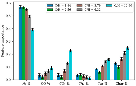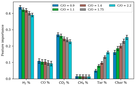 Simulations were conducted using the RF model varying the C/O and C/H ratios in the biomass composition; the C/N ratio was not varied as nitrogen is mostly inert during steam gasification, and the nitrogen percentage is very small compared with carbon (averaging at 1.36% across all of the studied biomasses, compared with 50% being the average carbon percentage) [26]. The goal of varying the ratios is to generate information about the suitability of different biomasses for gasification. Figure 8 shows the composition of the syngas at different C/O ratios during gasification at 973 K and a SBR of 0.8 (which are considered a low gasification temperature and intermediate SBR that will ensure tar is not thermally cracked nor reformed due to a high SBR [52,59]). It is shown that as the H2 and CO percentage decreases, the tar and char increase and the CO and CH4 exhibit a negligible change. The increase in char is related to the number of available C atoms for carbon formation, while change in tar percentage is related to a shift in the equilibrium in the water–gas shift reaction (CO + H2O ⟶ CO2 + H2), which is also related to the decrease in H2 and CO2.