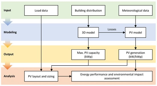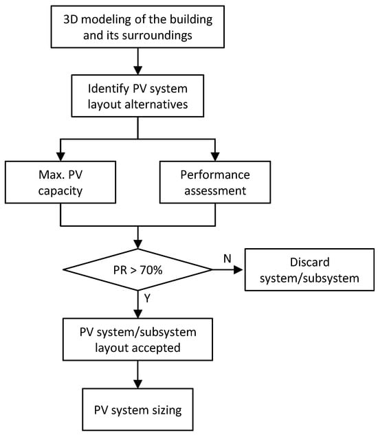 Building topology and facade orientation significantly influence their capacity to efficiently integrate PV systems. Moreover, shading is a critical factor, especially in cities where adjacent buildings and elements are common. Therefore, 3D modeling of the building and its surroundings is essential to determine the maximum installable PV power and characterize shading losses. Figure 2 illustrates the PV generator design and sizing process.