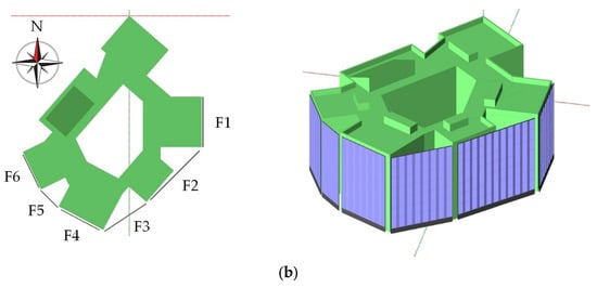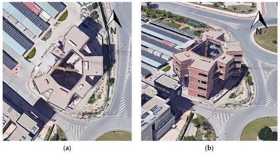This study focuses on a four-story research building at the University of Jaén, located at coordinates (37.7875°, −3.7736°). Figure 3 illustrates its surroundings and layout.