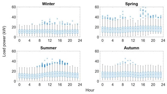 Building energy consumption boxplot aggregated by season and hour.