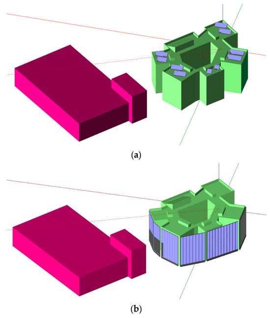 A 3D model of the building and its surroundings: (a) RTPV and (b) FAPV.