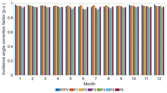 For the RTPV system, shadows are primarily caused by the building’s exterior wall and HVAC equipment. In contrast, facades 4, 5, and 6 of the facade system experience partial shading due to the adjacent building. The values obtained for the incidence angle correction factor are shown in Figure 7, aggregated by month and subsystem. The RTPV system exhibited the lowest annual IAM losses (3%), compared to the facade subsystems (4%, 5%, 5%, 7%, 7%, and 6%, respectively).