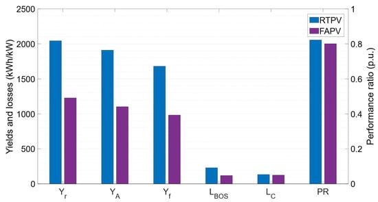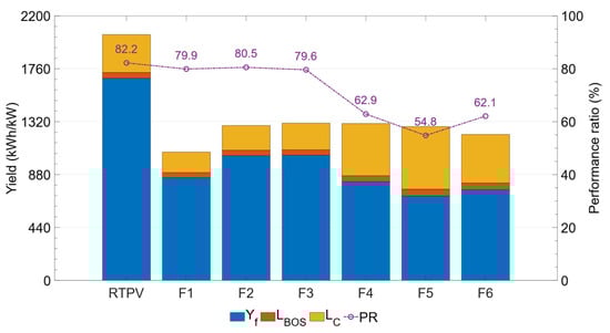 In this phase, the potential of each subsystem is assessed. Figure 9 illustrates the final yield, BOS losses, and capture losses for each PV subsystem. The RTPV system stands out with the highest final yield (1681 kWh/kW) and performance ratio (82%).
