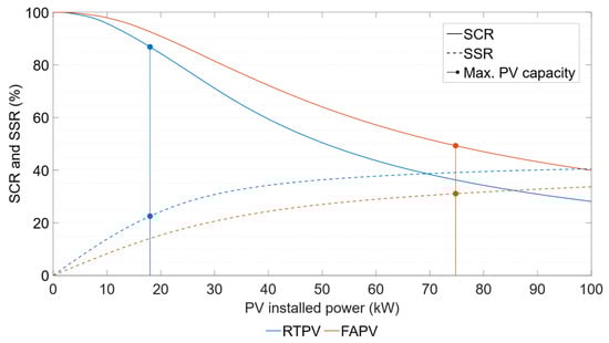 When representing the SSR as a function of the installed PV capacity, a linear region with a constant slope is observed. At the end of this linear region, the increase in SSR with respect to  gradually decreases due to the increase in PV surpluses. Therefore, it is favorable for the PV system capacity to be within the linear region to ensure its maximum utilization. A higher SSR implies less grid dependence and greater sustainability of consumed energy. Consequently, the PV system sizing criterion consists of maximizing the SSR, bounded by the linear region of this curve.