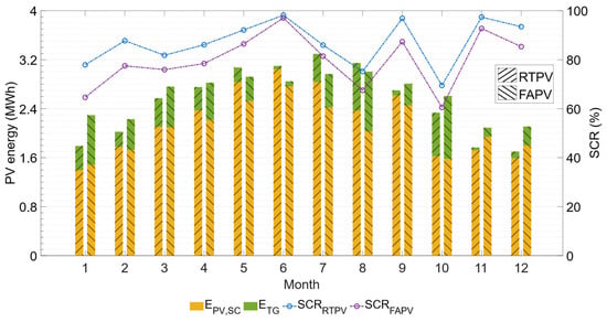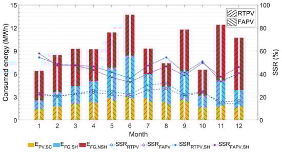 The self-sufficiency ratio (SSR), calculated according to Equation (15), represents the fraction of consumed energy that is covered by PV generation.