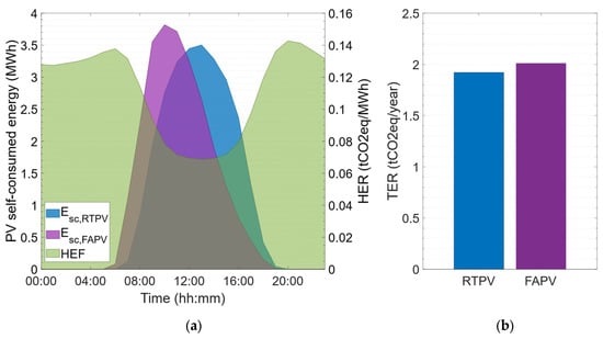 To evaluate the environmental impact of the installation, the Total GHG Emission Reduction (TER) index was chosen, calculated according to Equation (17) based on self-consumed PV energy and the hourly emission factor ().