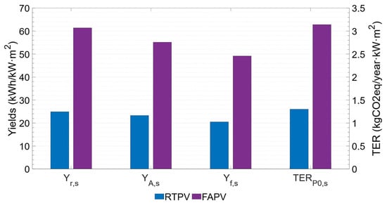 Finally, an energy and environmental analysis of the proposed PV system alternatives is performed. In the energy domain, parameters defined by standard IEC 61724-1 [] are considered, such as reference yield, array yield, final yield, and performance ratio. In the environmental domain, parameters like Hourly Emission Factor (HEF) and Total Emission Reduction (TER), widely used in the literature, are considered [,]. Additionally, complementary energy and environmental parameters are defined to compare the performance of PV systems based on their footprint area, which represents an advancement for comparing different PV configurations in urban environments.