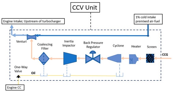 The function of the CCV system is to filter and recirculate CCG while maintaining acceptable engine operational stability. CCG consists of a mixture of unburned fuel–air, exhaust gases, and oil mist, that flows into and out of the engine crankcase. During the compression and expansion strokes, both unburned and burned gases in the combustion chamber are forced into the piston crevice volumes [