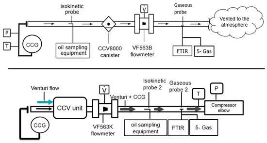 Figure 3 Top). In the Closed Crankcase Ventilation (CCV) configuration, the probe was used to characterize the gas flow rate, oil concentration, oil distribution, gas composition, temperature, and pressure of the CCG and venturi flow mixture downstream of the CCV unit (
