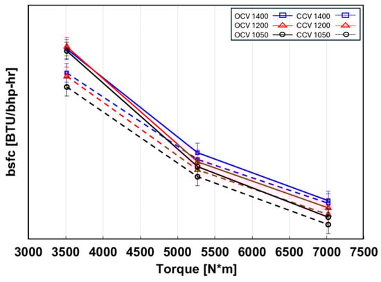13]. The total error of a variable was calculated by combining the instrumentation error and random error of that variable. The instrumentation error was calculated by searching the accuracy of every instrument used in the experiments and multiply by the instrument output scale or reading. Those errors were input it in the root of the sum of the squares (RSS) equation (Equation (13)) to account for the error propagation in the calculated variables. The random error was determined by selecting a specific engine operational load (100% load) at each speed for each configuration. The standard deviation of the measured variables was determined with a 95% confidence interval, and the standard deviation of the calculated variables was calculated by using Equation (16), which factors in the standard deviation of the measured variables. The final uncertainty of each variable was a combination of the instrumentation and random error, and it was calculated by Equation (18). This analysis revealed that the OCV-Direct method had a slightly higher uncertainty compared to the OCV-Indirect method due to the additional instrumentation used to characterize the CCG in the OCV-Direct method.