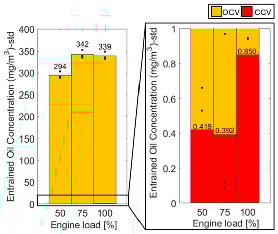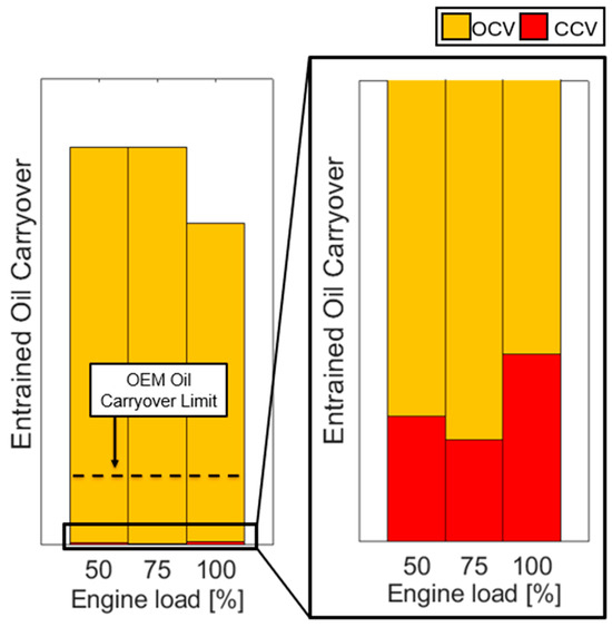 Additionally, the CCV system contributed to a marked decrease in oil consumption and particulate matter (PM) emissions. The oil concentration in crankcase gases (CCG) was significantly lower in the CCV configuration, and the system exhibited excellent filtration efficiency, achieving values between 99.23% and 99.91%. The analysis of oil particle size distribution showed that the CCV system significantly reduced the concentration of different oil particles sizes, thus preventing potential engine component fouling and reducing maintenance costs.