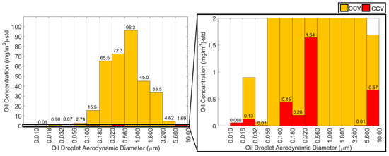 Oil concentration measurements were conducted under the same engine operating conditions. Each oil sample was collected over a duration of three minutes. For each load condition (50%, 75%, 100%) at 1400 RPM, three replicate samples were taken. At 1200 RPM and 1050 RPM, two samples were collected for each load. Oil droplet size distribution measurements using the cascade impactor were performed only at 1400 RPM and 100% load, with each sampling period lasting seven and a half minutes.