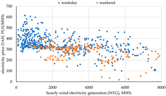 Over the past few years, electricity prices have been rising significantly. Additionally, a recurring phenomenon is the co-occurrence of relatively lower electricity prices with high volumes of wind power generation. Figure 1 illustrates electricity prices for the period 2021–2024 in the Day-Ahead Market (DAM), while Figure 2 shows the relationship between electricity prices and hourly wind power generation values. Since 2023, prices have increasingly approached or even fallen below zero during periods of high wind turbine generation. This observation inspired an investigation into whether the application of an energy storage system alongside a wind turbine could lead to increased revenues from a combined wind turbine and energy storage installation.