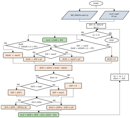 Computational algorithm—block diagram. This simplified flowchart presents the logic behind the computations defined in Equations (1)–(11). Compared to the original equations, the representation of the stored energy from the previous hour was simplified: instead of , the variable was used to avoid repeating the time index (τp) throughout the flowchart. Source: authors’ own elaboration.