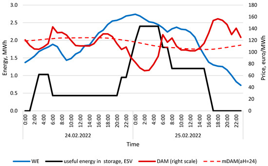 Day-ahead electricity price (DAM) and 24-h mean of DAM, wind turbine Energy generation and amount of useful energy in storage, calculated for 24 and 25 February 2022. Calculation conditions: minP′ = 100 kW, maxP′ = 1200 kW, maxC = 2400 kWh, FP = 0.12, aH = 24. Source: own study.