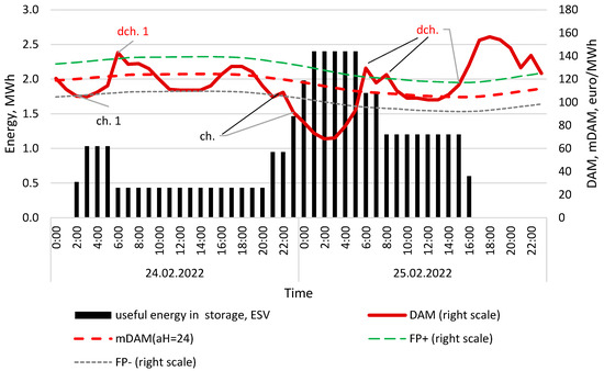 Day-ahead electricity price (DAM) and 24-h mean of DAM (mDAM) with range based on FP, wind turbine energy generation and amount of useful energy in storage, calculated for 24 and 25 February 2022. Calculation conditions: minP′ = 100 kW, maxP′ = 1200 kW, maxC = 2400 kWh, FP = 0.12, aH = 24. Source: own study.