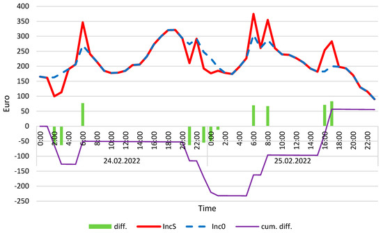 Income from wind turbine with energy storage (IncS) and without (Inc0) and also differences between both values, calculated for 24 and 25 February 2022. Calculation conditions: minP′ = 100 kW, maxP′ = 1200 kW, maxC = 2400 kWh, FP = 0.12, aH = 24. Source: own study.