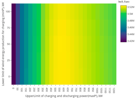 The dependence of on the minimum available power from the wind turbine (left part of the chart) proved to be less significant within the analyzed range. However, setting a minimum generation threshold for turbine output allocated to battery charging remains important for the storage system’s operational logic.