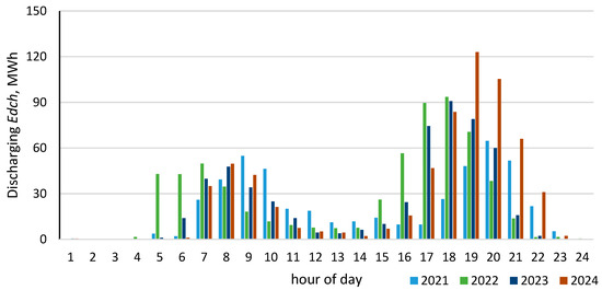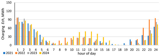 Figure 8 illustrates the hourly dynamics of energy storage discharge operations throughout the day. The majority of discharge events occurred during the evening peak in electricity demand. The second most frequent period of discharge was during the morning peak demand hours. Figure 9 illustrates the hourly sum of energy charging for every year of calculation.
