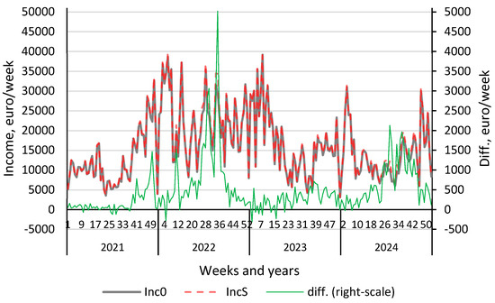 To illustrate the differences between the energy storage and non-storage scenarios, Figure 10 presents the weekly revenue values and their respective differences. The weekly perspective serves as a compromise between daily and annual analysis—this time interval enables generalization of findings without being biased by the initial and final states of charge of the storage system.
