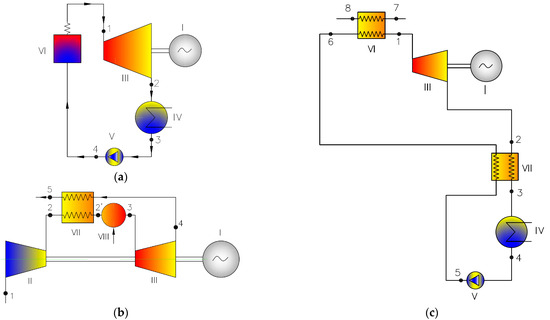 Steam cycle with water/steam as the working medium—Var1 (a), gas cycle with regenerator—Var2 (b), and cycle with organic working medium—Var3 (c), where I—generator, II—compressor, III—gas or steam turbine, IV—condenser, V—circulation pump, VI—steam generator, VII—regenerator, VIII—combustion chamber, 1, 2, … 8 are successive characteristic points of the cycle.