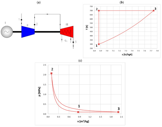 Innovative turbine cycle (a), and interpretation of thermodynamic changes in the temperature-specific entropy (b) and pressure-specific volume (c) coordinate system, where I—generator, II—compressor, III—isothermal air turbine, q1—heat supplied to the system, and 1, 2, 3 are successive characteristic points of the cycle.