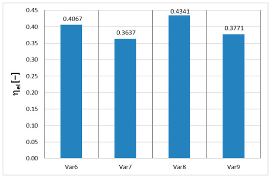 Comparison of efficiency for the analyzed variants of combined steam-gas cycles, where the variants are as follows: Var6—single-flow gas–steam system with water/steam as the working medium, Var7—single-flow gas–steam system with a so-called ‘dry’ organic medium, Var8—double-pressure gas–steam system with water/steam as the working medium; Var9—double-pressure gas–steam system with an organic medium.