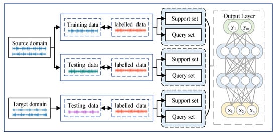 Based on meta-learning, the central concept of the deep neural network is to decompose the model’s training process into two levels of optimization processes, namely, an internal one and external one. In internal optimization, the model uses strategies such as the gradient descent method to learn specific tasks and master prior knowledge. In external optimization, the focus is to improve the learning effect of the model across tasks, and the goal is to determine an optimal set of initial model parameters . Therefore, during the model testing phase, only a few samples are needed to fine-tune , which enable one to quickly adapt the model to the task and achieve a high classification accuracy.