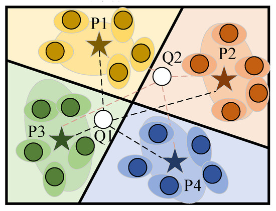 The Gaussian Prototypical Network is a model designed for few-shot learning. It maps input data into embedding vectors while simultaneously generating an estimate of quality and a confidence region around the embedding, which is characterized by a Gaussian covariance matrix. As illustrated in Figure 2, P1, P2, P3, and P4 represent different categories of prototypes, each with a set of feature distributions. In the figure, circles of the same color surrounded by stars represent the prototype representations of the features for each category. Q1 and Q2 are the query samples to be classified. According to the distance between the query samples and each prototype, the category embedded samples are formed to determine the category to which they belong.