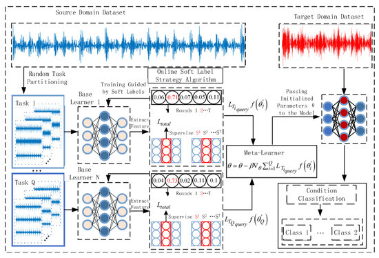 In the equation, represents the learning rate of the base learner, and is the gradient of the loss on the support set of tasks . After obtaining Q parameters θ where , the loss of the query set is calculated as shown in Equation (23):