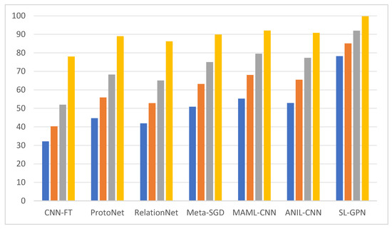 To validate the effectiveness of the proposed method, several classical few-shot learning approaches are selected for comparison. First, we compare with a conventional pretraining–fine-tuning transfer learning algorithm (CNN-FT) to demonstrate the advantages of meta-learning. Second, we compare with two representative metric-based meta-learning algorithms: the Prototypical Network (ProtoNet) and the Relation Network (RelationNet), as well as a Gaussian Prototype Network based on soft labels (SL-GPN), to further evaluate the performance of the proposed approach. In addition, Meta-Stochastic Gradient Descent (Meta-SGD) is an adaptive optimizer that integrates meta-learning concepts, dynamically adjusting learning rates through mapping historical gradient information. Model-Agnostic Meta-Learning (MAML-CNN), a model-agnostic framework, enables CNNs to rapidly adapt to new tasks and data distributions. For the Almost No Inner Loop (ANIL-CNN) model, a variant of model-agnostic meta-learning, it freezes the feature extraction layer and only updates parameters such as the classifier in the last layer.